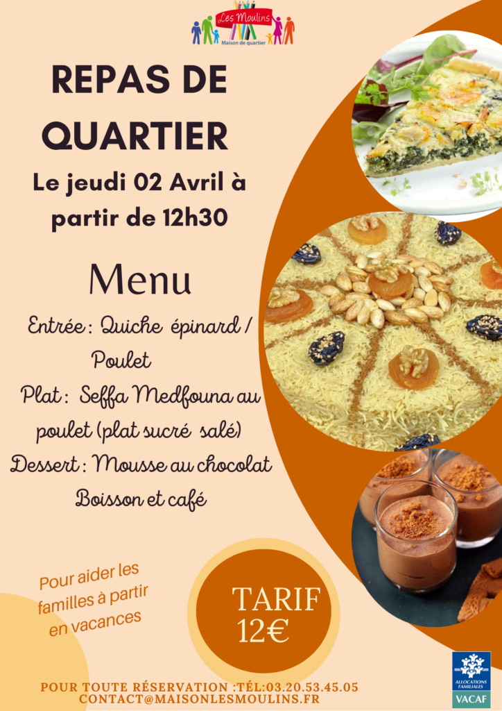 Repas de quartierPublication publiée :17 mars 2026 Vous devriez également aimer Tout public : Visite de la maison des solidarités – vendredi 27 mars 18 mars 2026 Tout public : Spectacle de marionnettes – mercredi 01 avril 11 mars 2026 Fête de l’Aid 17 mars 2026