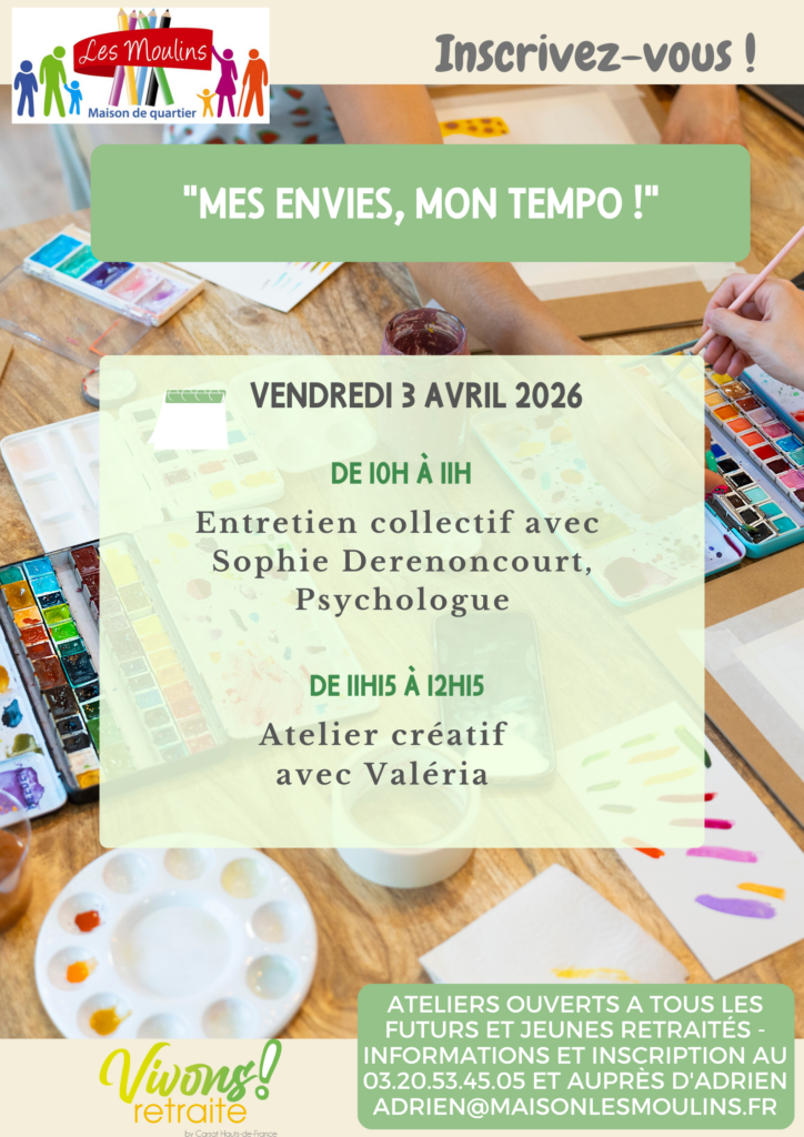 Inscriptions et informations auprès de l’accueil : 0320534505 ou à adrien@maisonlesmoulins.fr