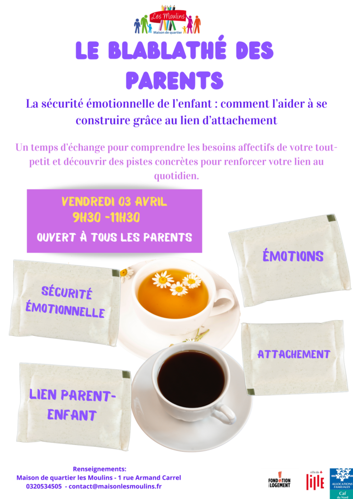La Maison de quartier Les Moulins vous propose un blablathé des parents pour échanger autour de la sécurité émotionnelle de l’enfant :